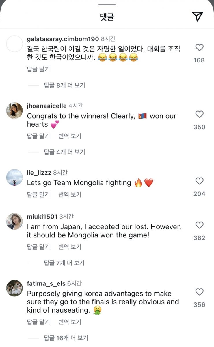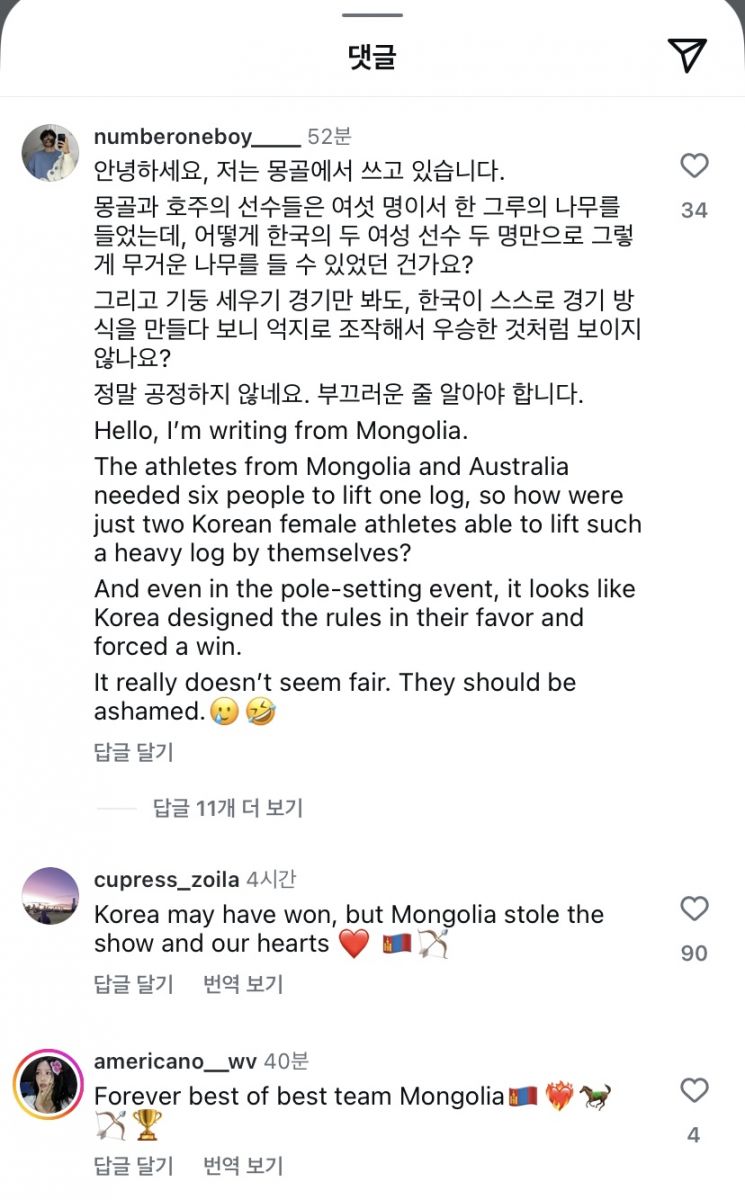 Энэ тухай нийтлэг сэтгэгдлүүдээс дурдвал "Солонгосын баг тэмцээнийг зохион байгуулж байгаа учраас ялах нь тодорхой байсан", "Би Япон хүн. Ялагдлаа хүлээн зөвшөөрч байна. Гэхдээ Монголын баг жинхэнэ ялагчид байсан", "Монгол, Японы баг зургуулаа нийлж хүнд жинтэй мод өргөж байсан. Тэр модыг тийм ч амархан өргөж чадахгүй байгаагаа ч хэлж байсан. Гэтэл хоёр Солонгос эмэгтэй яаж тийм хүнд модыг хоёулхнаа өргөж чадав аа?, Солонгосчууд ялахын тулд тоглоомыг өөрсдийн талд урвуулан ашигласан бололтой" гэжээ.