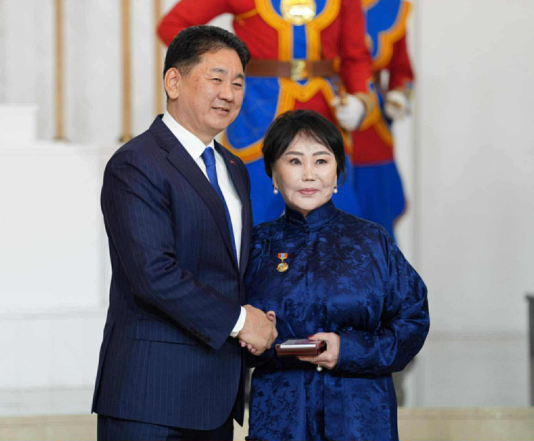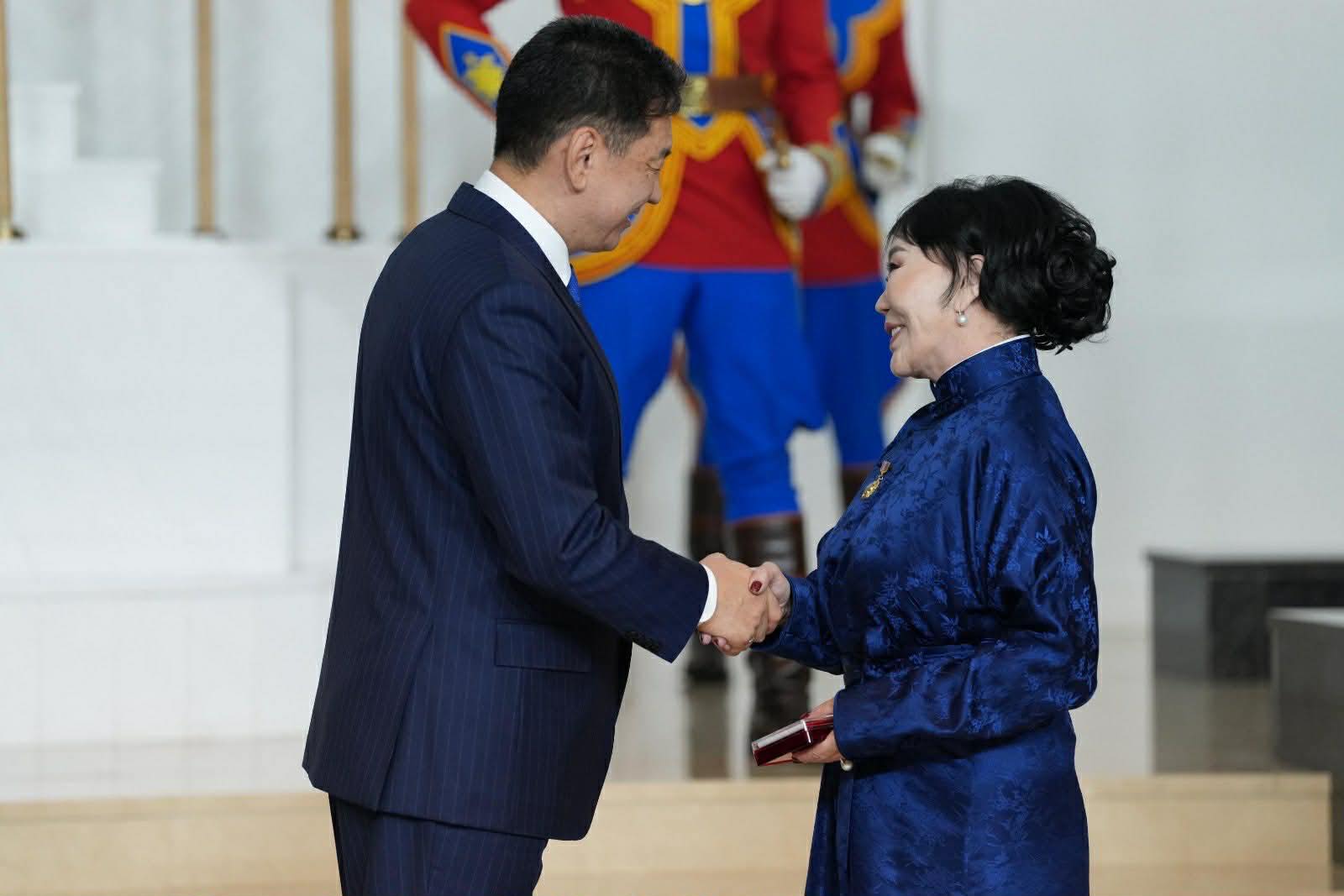 Монгол Улсын Ерөнхийлөгч У.Хүрэлсүх Анхдугаар Үндсэн хуулиа баталж, Бүгд Найрамдах Улс тунхагласан өдрийг тохиолдуулан төрийн дээд цол, одон, медаль гардуулж байна. Тодруулбал, Баянзүрх дүүргийн 10-р хороонд байрлах Амгалан захын хүнсний худалдаа, агуулахын үйл ажиллагааг эрхэлж, 600 гаруй иргэнийг тогтмол ажлын байртай байлгаж, улс эх орны хөгжил, бүтээн байгуулалтад үнэтэй хувь нэмэр оруулан ажиллаж буй Л.Уранцэцэгийг “Худалдааны гавьяат ажилтан" цол тэмдгээр шагналаа.
