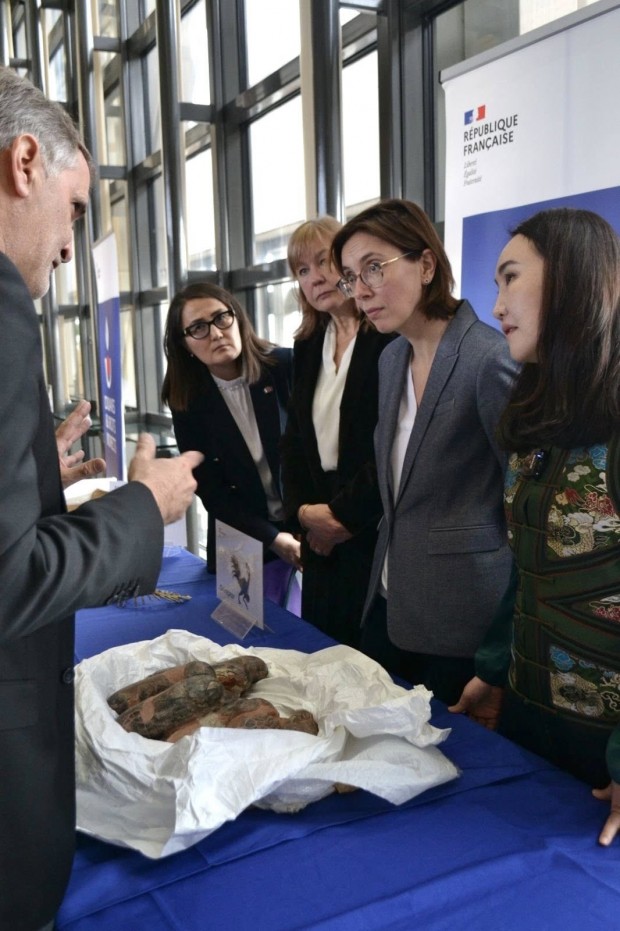 Бүгд Найрамдах Франц Улсын хууль сахиулах байгууллагаас 2013, 2015 онд хураасан үлэг гүрвэлийн чулуужсан олдворыг Монгол Улсад үнэ төлбөргүй хүлээлцэх актад гарын үсэг зурах ёслолын арга хэмжээ 2025 оны арванхоёрдугаар сарын 08-ны өдөр Парис хотноо зохион байгуулагдлаа. Тус улсын хууль сахиулах байгууллагын шалгалтаар эдгээр олдворууд нь Монгол Улсын говиос олддог үлэг гүрвэлийн чулуужсан олдвор болох нь тогтоогджээ.