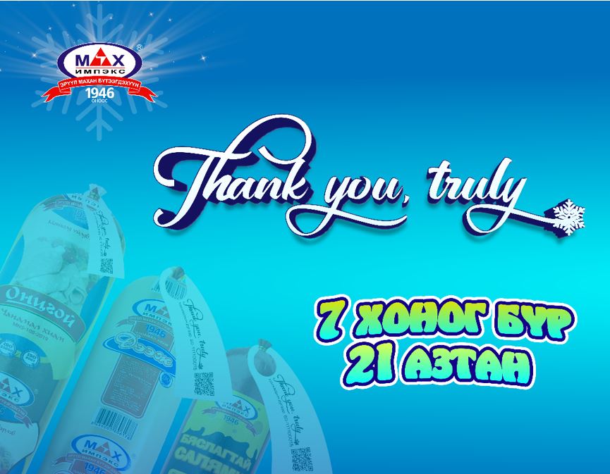Түүхт 80 жилийн ойгоо угтаж буй “Мах импэкс” ХК нь шинэ оны босгонд бүхий л цаг үед хамт байсаар ирсэн нийт хэрэглэгч, харилцагч, үе үеийн түүхийг бүтээлцсэн ажилчид болон малчин түмэндээ “Thank you, truly” буюу “Чин сэтгэлээсээ бүх зүйлд баярлалаа” хэмээх талархлын кампанит ажил эхлүүллээ. Энэхүү кампанит ажлын хүрээнд 8 настай балчраас 80 настай буурай хүртэлх бүхий л хэрэглэгчдэдээ талархал илэрхийлэхээр олон сонирхолтой урамшуулал, бэлгүүдийг бэлдээд буй юм.