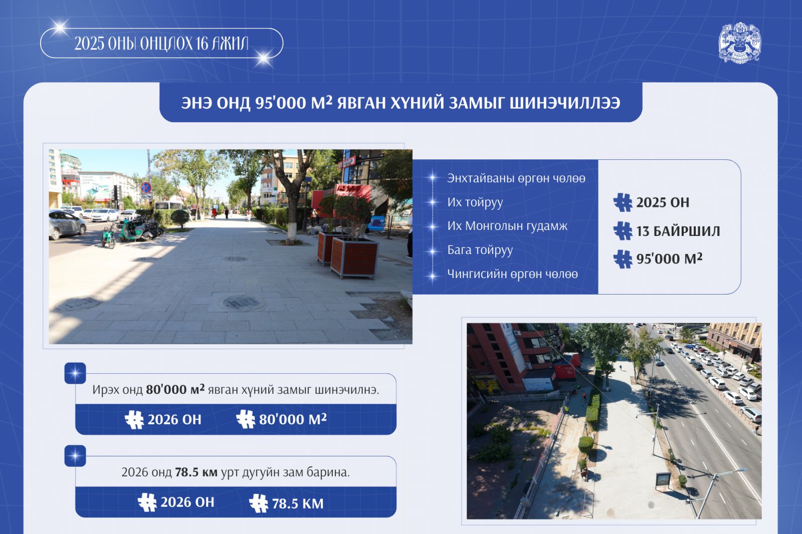 Энэ онд Улаанбаатар хотын гол гудамж, замууд болох Энхтайваны өргөн чөлөө, Их тойруу, Бага тойруу, Их Монголын гудамж болон Чингисийн өргөн чөлөө дагуух 13 байршилд 95 мянган ам.метр явган хүний замыг шинэчиллээ. Явган хүний замыг барзгар гадаргуутай байгалийн чулуун хавтангаар шинэчилж буй онцлогтой. 2026 онд үргэлжлүүлэн 80 мянган ам.метр явган хүний замыг шинэчилнэ. Барилгын ажлыг ирэх оны хавар эхлүүлнэ.
