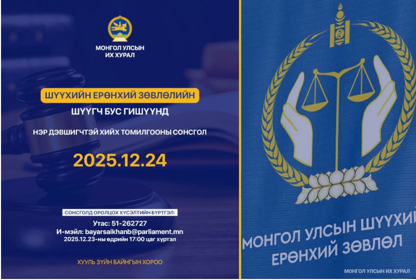 Хууль зүйн байнгын хорооны 2025 оны 12 дугаар сарын 09-ний өдрийн хуралдаанаар Шүүхийн ерөнхий зөвлөлийн шүүгч бус гишүүнд нэр дэвшигч 4 иргэнтэй хийх “ТОМИЛГООНЫ СОНСГОЛ”-ыг 2025 оны 12 дугаар сарын 24-ний өдөр зохион байгуулахаар тогтлоо.