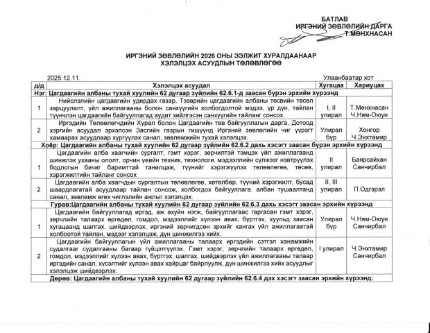Ийнхүү хурлаар Тээврийн цагдаагийн албаны Замын цагдаагийн газрын үйл ажиллагаанд хяналт, шалгалт хийж, дүн шинжилгээ хийх ажлыг удирдамжийн дагуу зохион байгуулах, дүүрэг дэх цагдаагийн газар, хэлтсийн үйл ажиллагаатай танилцах, алба хаагчидтай уулзалт хийж, үнэлэлт дүгнэлт өгөх ажлыг үргэжлүүлэхээр тогтлоо. Мөн Иргэний зөвлөлийн гишүүдийн саналыг хэлэлцэн ирэх оны Иргэний зөвлөлийн ээлжит хурлаар хэлэлцэх асуудлын төлөвлөгөө гаргаж батлав.