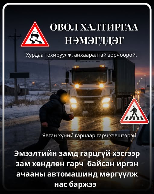 Мөн жолооч тээврийн хэрэгслийн техникийн бүрэн бүтэн байдлыг хангаж, Замын хөдөлгөөний дүрмийг чанд мөрдөн, халтиргаа гулгаа ихтэй үед тохирсон хурдыг тогтоосон хэмжээнээс хэтрүүлэхгүй байхыг анхаарууллаа.