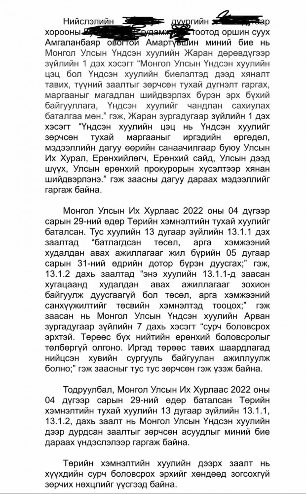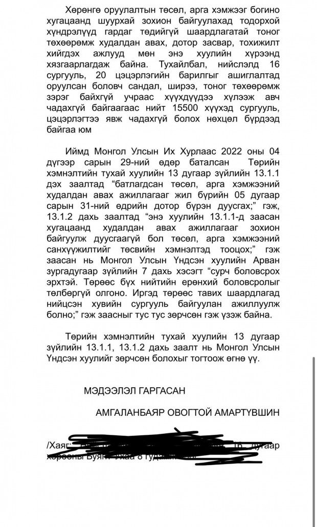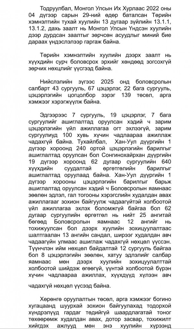 Ширээ сандал хүрэлцэхгүй, агааржуулалтгүй анги танхимд 60-80 хүүхэд сууж суралцах нь эрүүл аюулгүй орчин гэж үзлээ. Хүүхдүүд өвдсөн үедээ эмнэлгийн коридорт хэвтэх нь эрүүл аюулгүй орчинд өсөн торниж байна гэжээ. Хамгийн гол нь үндсэн хуулиар хугацаагүй олгосон эрхийг “Хэмнэлтийн тухай” хуулиар хугацаа тогтоож буйг үндсэн хууль зөрчсөн үйлдэл гэж миний бие үзээд байгаа юм. Та бүхэн маань ч гэсэн санал нийлж байна уу? Жич: өргөдөл болон хариу мэдэгдлийн зургийг оруулав" хэмээжээ.