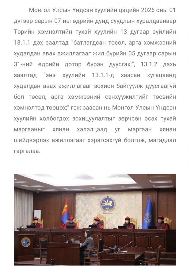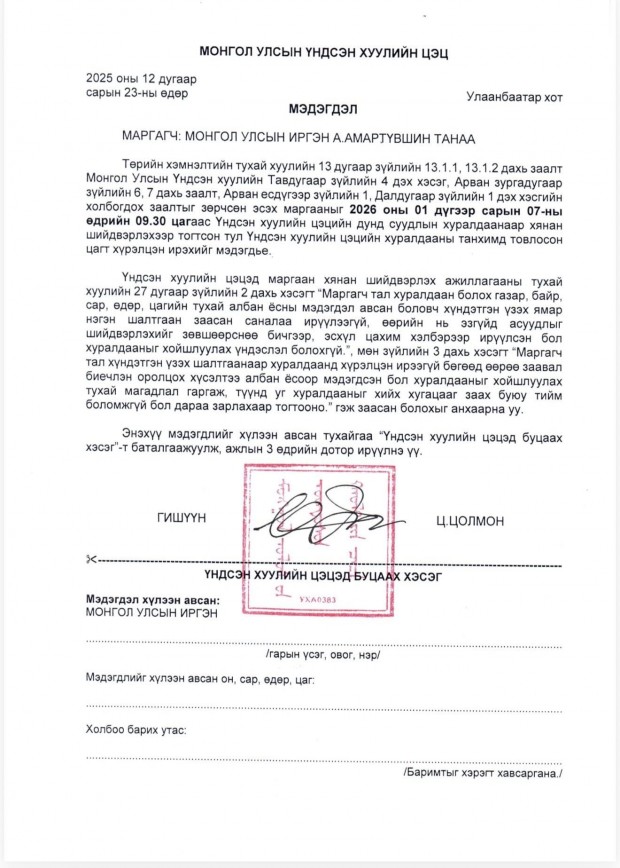 Нийслэлийн Засаг даргын орлогч А.Амартүвшин иргэн хүнийхээ хувьд үндсэн хуулийн цэцэд ханджээ. Тэрбээр энэ талаараа "А.Амартүвшин миний бие үндсэн хуулийн цэцэд хүүхдийн сурч боловсрох эрх, хэмнэлтийн тухай хуулийн заалтаар зөрчигдөж байна хэмээн хандсан. Тодруулбал сургууль цэцэрлэгийн тоног төхөөрөмж худалдан авах тендерийн гэрээгээ 5 дугаар сарын 31-ны дотор хийгээгүй бол “Хэмнэлтийн тухай” хуулиар төсвийг эргүүлэн татдагийг хүүхдийн сурч боловсрох эрхэнд халдаж байна хэмээн хандсан юм. Харин энэхүү гомдлын хариуг уржигдар буюу 2026.01.07 ны өдрийн дунд суудлын хуралдаанаар хэлэлцэж хүүхдийн сурч боловсрох үндсэн эрхэд халдаагүй хэмээн шийдвэр өглөө.