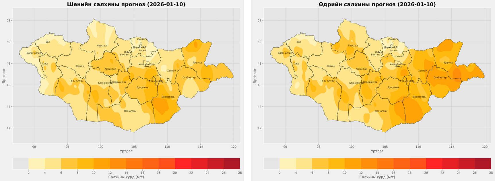 Салхи: Нутгийн баруун хэсгээр баруунаас, бусад нутгаар баруун хойноос секундэд 5-10 метр, говь, тал хээрийн нутгаар секундэд 14-16 метр хүрч ширүүснэ.