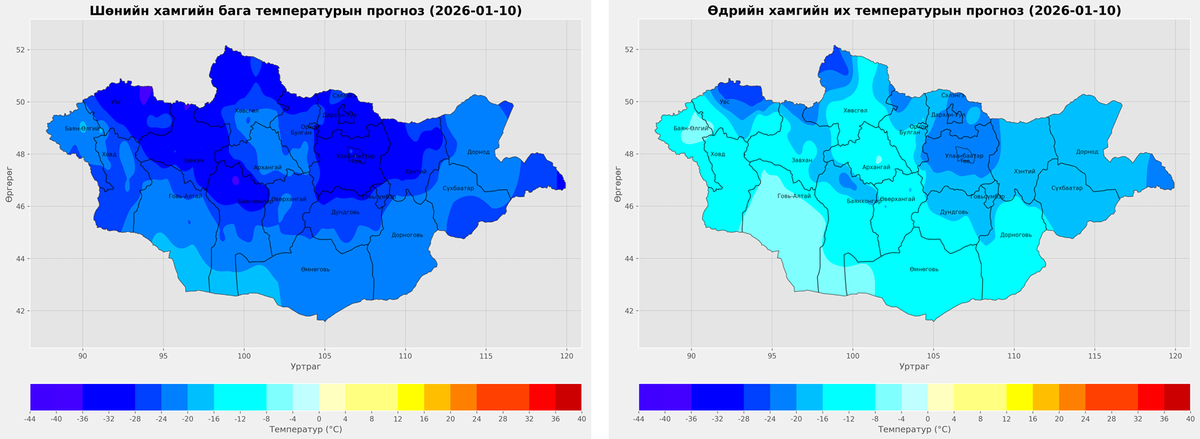 Агаарын температур: Шөнөдөө Увс нуур болон Дархадын хотгор, Завхан, Заг-Байдраг голын эх, Идэр, Тэс, Эг, Үүр, Ерөө голын хөндийгөөр -33...-38 градус, Хангай, Хөвсгөл, Хэнтийн уулархаг нутаг, Орхон, Сэлэнгэ, Хараа, Туул, Тэрэлж, Хэрлэн голын хөндийгөөр -29...-34 градус, говийн бүс нутгийн баруун өмнөд хэсгээр -14...-19 градус, Их нууруудын хотгор, Хангайн нурууны өвөр бэл, говийн бүс нутгийн зүүн болон хойд хэсгээр -19...-24 градус, бусад нутгаар -24...-29 градус хүйтэн, өдөртөө Дархадын хотгор, Тэс голын хөндийгөөр -24...-29 градус, Увс нуурын хотгор, Хэнтийн уулархаг нутаг, Завхан, Заг-Байдраг голын эх, Идэр, Эг, Үүр, Хараа, Ерөө, Туул, Тэрэлж, Хэрлэн, Онон, Улз, Халх голын хөндийгөөр -19...-24 градус, говийн бүс нутгийн баруун өмнөд хэсэг, Хангайн нурууны өвөр бэлээр -3...-8 градус, Их нууруудын хотгор, Алтайн уулархаг нутгаар -8...-13 градус, бусад нутгаар -15...-20 градус хүйтэн байна.