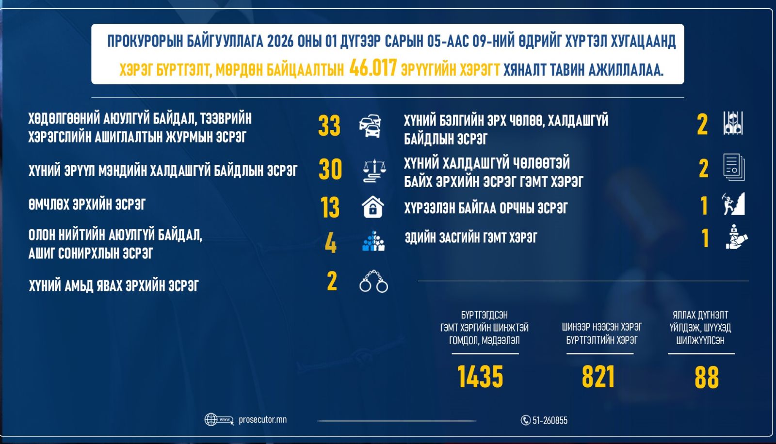 Прокурорын байгууллага 2026 оны 01 дүгээр сарын 05-ны өдрөөс 09-ний өдрийг хүртэлх хугацаанд хэрэг бүртгэлт, мөрдөн байцаалтын 46,017 эрүүгийн хэрэгт хяналт тавин ажиллажээ. Дээрх хугацаанд 1435 гэмт хэргийн шинжтэй гомдол, мэдээлэл бүртгэгдсэн бол хэрэг бүртгэлтийн 821 хэрэг шинээр нээж, 88 хэрэгт прокурор яллах дүгнэлт үйлдсэн байна.