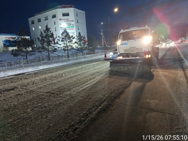 Гудамж, талбайн цас цэвэрлэхээр нийт 280 хүн, 54 техник, 84 бичил төхөөрөмжтэй ажиллаж байна. Зам талбайд 45 тонн давс, 84 тонн бодис цацсан бөгөөд 1149.5 тонн давс, 471.5 тонн бодис, 94 шоо метр дайргын нөөцтэй байна.