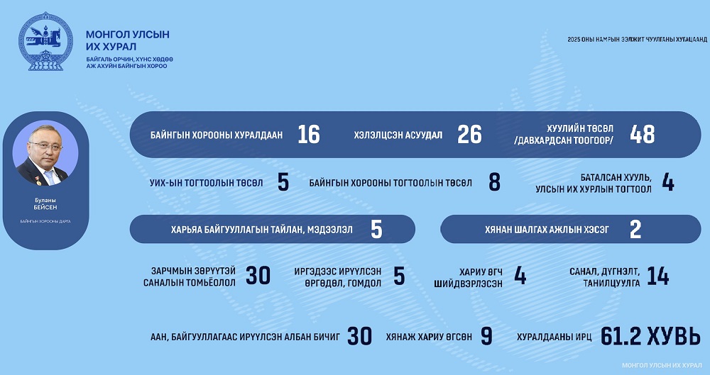 Мөн Засгийн газраас 2025 оны 11 дүгээр сарын 19-ний өдрийн өргөн мэдүүлсэн “Тогтоолд нэмэлт оруулах тухай” Монгол Улсын Их Хурлын тогтоолын төслийг Төсвийн болон Байгаль орчин, хүнс хөдөө аж ахуйн байнгын хорооны хамтарсан хуралдаанаар хэлэлцүүлж, нэгдсэн санал, дүгнэлт гарган чуулганы 2025 оны 12 дугаар сарын 11-ний өдрийн нэгдсэн хуралдаанаар хэлэлцүүлэн батлуулсан байна.