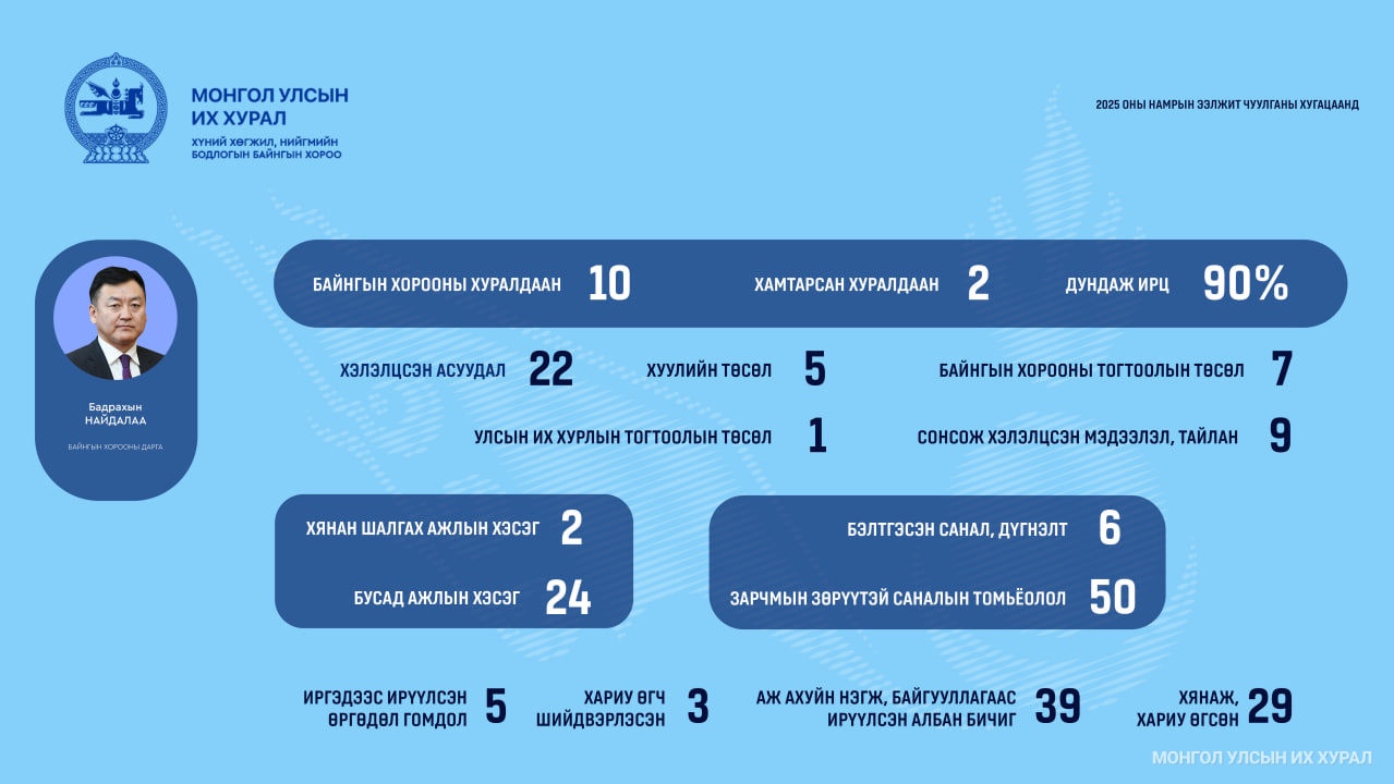 Улсын Их Хурлын чуулганаар хэлэлцсэн асуудлуудтай холбогдуулан Байнгын хорооноос зургаан санал дүгнэлт, зарчмын зөрүүтэй саналын 50 томьёолол бэлтгэжээ.