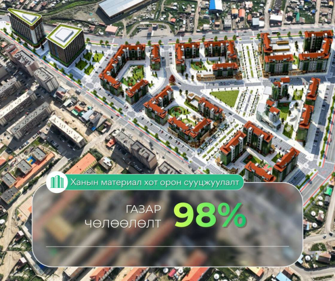 Улаанбаатар хотын агаар, орчны бохирдол, авто замын түгжрэл, иргэдийн амьдралын чанарыг дээшлүүлэх зорилтын дагуу мега төслүүдийг үе шаттай хэрэгжүүлж буй. Энэ хүрээнд “20 минутын хот” нэгдсэн төлөвлөлтийг баримтлан төлбөрийн чадварт нийцсэн орон сууцны хангамжийг нэмэгдүүлэх зорилгоор Сонгинохайрхан дүүргийн 5 дугаар хороо, Ханын материалд 3000 айлын орон сууцны төслийг 20.7 га талбайд хэрэгжүүлэхээр төлөвлөсөн. Төслийн нэгдүгээр үе шатанд нийт 232 нэгж талбарыг чөлөөлөхөөс гүйцэтгэл 98 хувьтай үргэлжилж байна. Мөн барилгын ажлын зураг төсөл 75 хувийн гүйцэтгэлтэй байгаа юм.