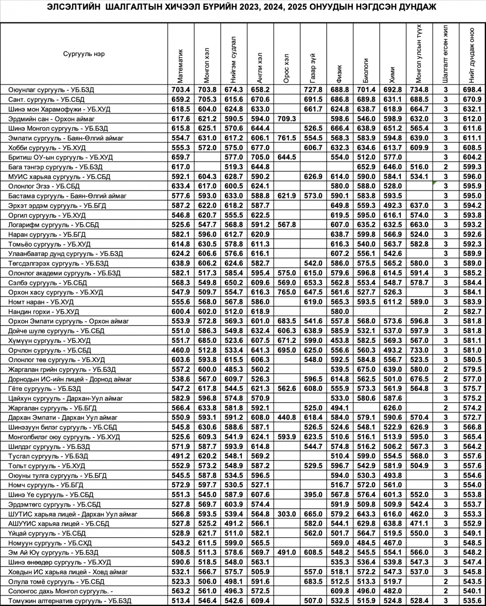 Хүснэгт 1: Элсэлтийн ерөнхий шалгалтын 2023, 2024, 2025 оны эрэмбэ