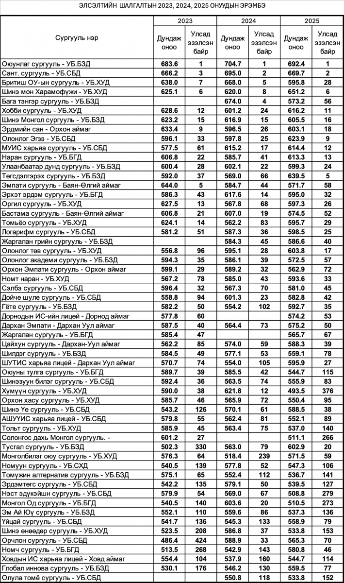 Энэхүү мэдээлэл нь Боловсролын яам, БҮТ-өөс аймаг, нийслэл, дүүрэг болон сургууль тус бүрд илгээгдсэн шалгалтын үндсэн мэдээлэлд тулгуурлан, ерөнхий дундаж онооны үзүүлэлтээр тооцон, харуулсан үр дүн, эрэмбийн үзүүлэлт болохыг сануулъя.