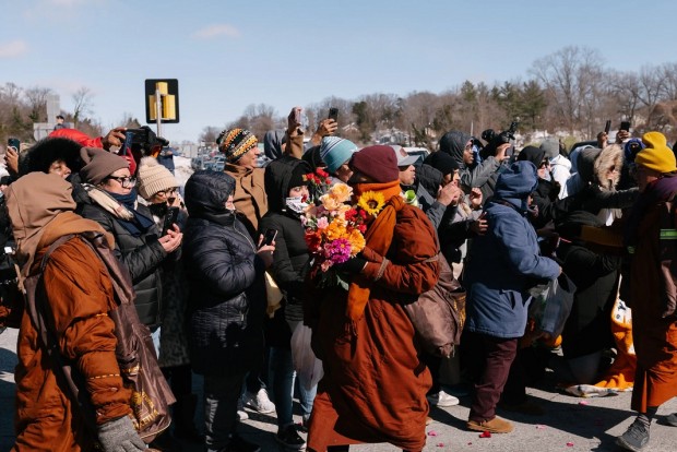 Тэднийг харах гэж Вашингтоны сүмийн урд олон мянган хүн цугларч, цэцгийн баглаа, урмын үг бүхий плакат барин угтсан байна.