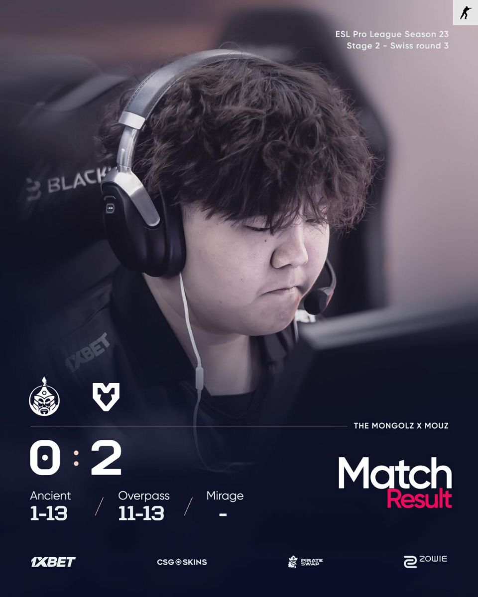 Дэлхийн брэнд 1xBet-ийн албан ёсны түнш The MongolZ баг ESL Pro League Season 23 тэмцээний гурав дахь өдрийн тоглолтод MOUZ багт 0:2 харьцаатайгаар хожигдож, тэмцээнийг 2:1 гэсэн үзүүлэлттэйгээр үргэлжлүүлэхээр боллоо. Тэд дараагийн тэмцээндээ ялалт байгуулсан тохиолдолд шигшээ шатанд шалгарах эрхтэй болно.