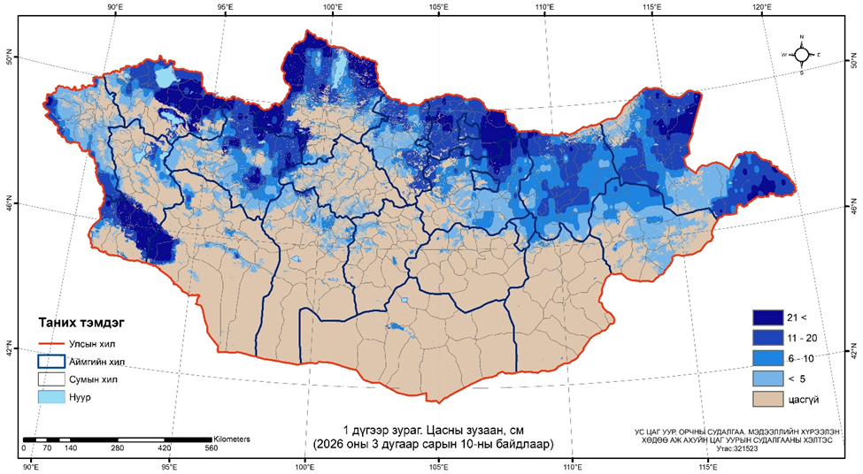 Ус цаг уур, орчны судалгаа, мэдээллийн хүрээлэнгээс арав хоногт нэг удаа хийдэг хээрийн цасны хэмжилтийн мэдээгээр гуравдугаар сарын 10-ны байдлаар нийт нутгийн 45 хувьд цастай байна.