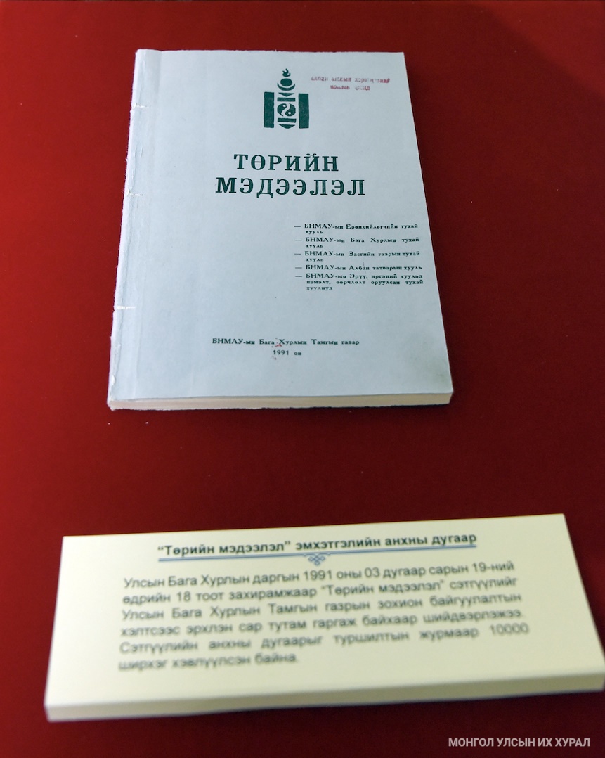 -Ардын засаг, төр анх байгуулагдсан цагаас эхлэн хууль шийдвэрээ олон нийтэд хүргэж сурталчлахад ихээхэн анхаарч байжээ. Тухайлбал, 1924 оны 11 дүгээр сарын 28-нд болсон Улсын анхдугаар Их Хурлаас баталсан тогтоолд “хурлаар тогтсон хэрэг ба хэлэлцсэн илтгэл, элдэв саналыг огт орхигдуулахгүйгээр харьяат Улсын Бага Хурал болон эрхлэх газруудаас эрхлэн гүйцэтгэх ба олон төлөөлөгч нар цөм санаа тавин ард олонд ухуулан явуулах буй за хэмээн итгэж байна” гэж заасан байв. Мөн тухайн үеийн Улсын Бага Хурал “…алив хэлэлцэн тогтоосон ба баталсан олон зүйлийн чухал чухал хэргүүдийн учир утгыг олон нийтэд сэнхрүүлэн ухуулж танилцуулах ба басхүү Үндсэн хуулийг тайлбарлан гаргаваас зохих тул ийнхүү ухуулга гаргах ба тайлбарлах явдлыг харьяат хурлын тэргүүлэгчид эрхлүүлэн гүйцэтгэхээр тогтоов” гэх зэргээр энэ асуудлыг чухалчлан үзэж байсан байна.