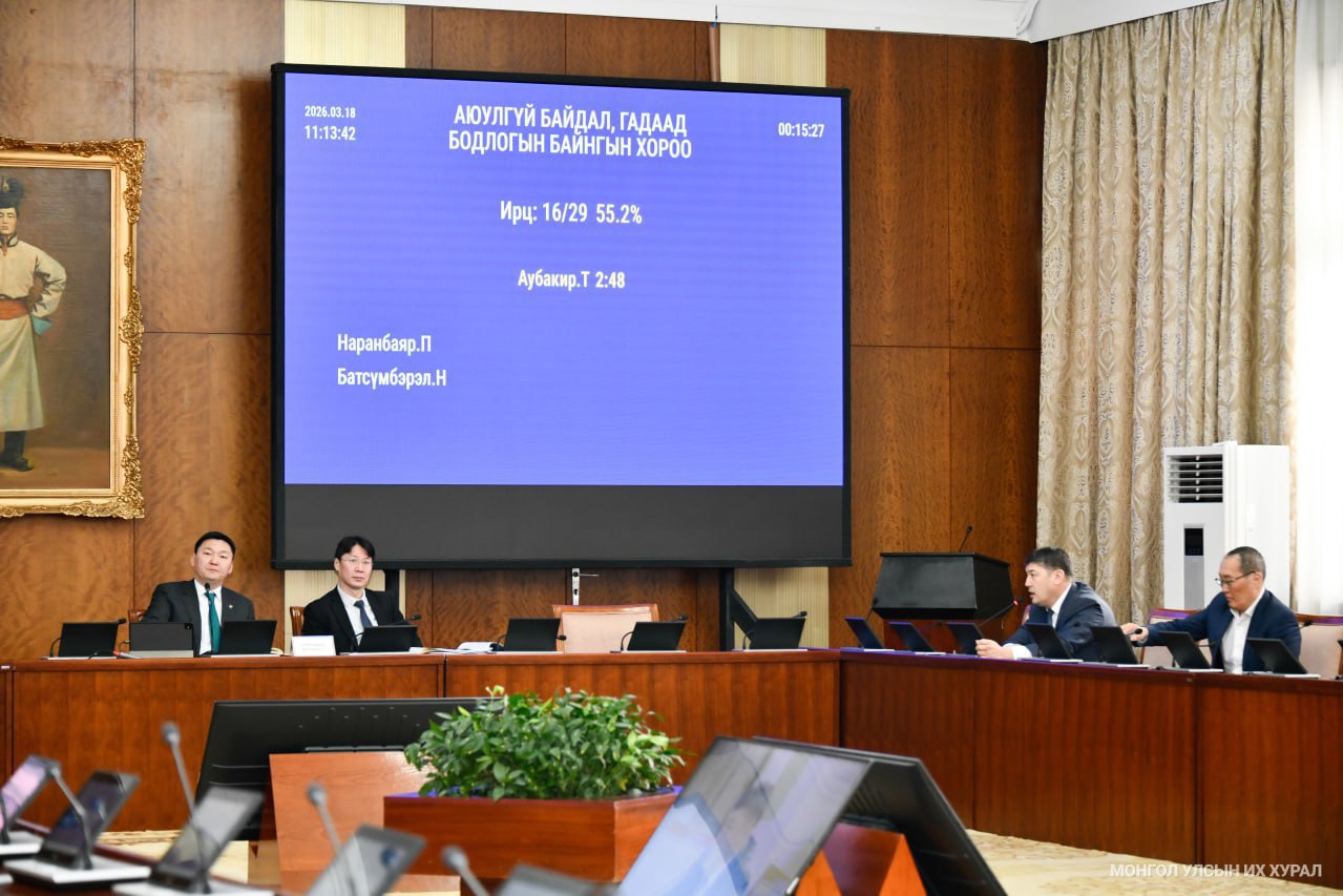 Улсын Их Хурлын Аюулгүй байдал, гадаад бодлогын байнгын хорооны өнөөдрийн (2026.03.18) хуралдаан 10 цаг 58 минутад эхэлж, Байнгын хорооны дарга Г.Тэмүүлэн Монгол Улсын Их Хурлын чуулганы хуралдааны дэгийн тухай хуулийн 7 дугаар зүйлийн 7.8 дахь хэсэгт заасны дагуу хуралдааны ирцийг нэрээр танилцуулав. Байнгын хорооны 29 гишүүний 51.7 хувь буюу Улсын Их Хурлын гишүүн О.Амгаланбаатар, Э.Бат-Амгалан, Н.Батсүмбэрэл, Д.Ганбат, Х.Жангабыл, С.Лүндэг, П.Наранбаяр, Г.Хосбаяр, Д.Цогтбаатар, Б.Энхбаяр, Ж.Энхбаяр, Л.Энхнасан, Д.Энхтүвшин, С.Эрдэнэболд нар хүрэлцэн ирснээр хуралдаан эхэлсэн юм.