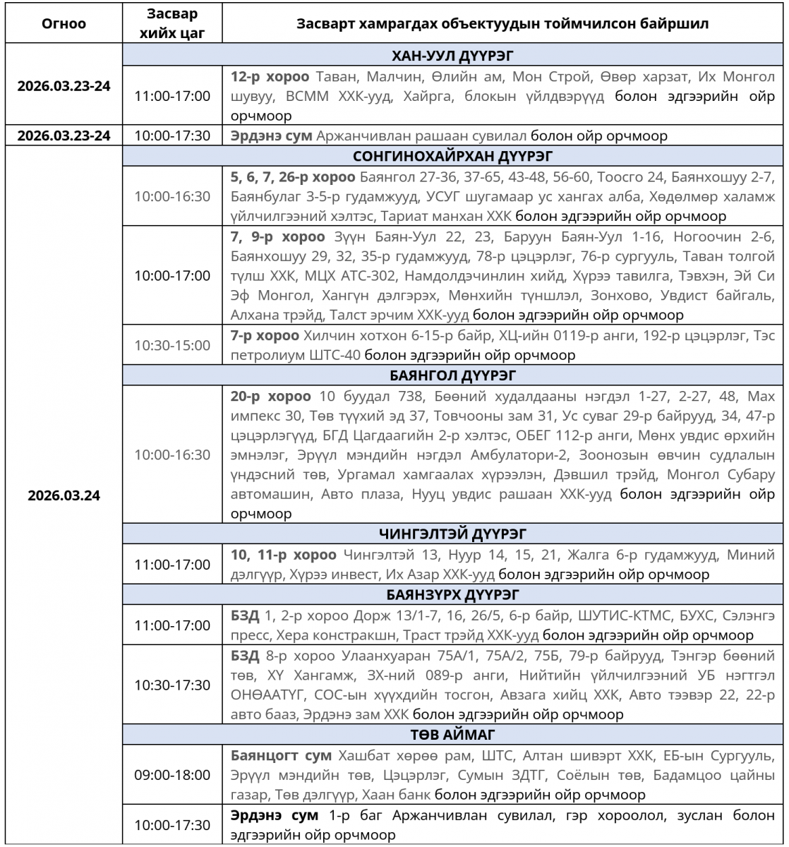 ЖИЧ: Цаг агаарын нөхцөл байдлаас шалтгаалан хуваарьт өөрчлөлт орвол, гэрээт бүртгэлтэй утасны дугаарт мэдээлэл хүргэх болно. Засварын ажлыг тухайн тоноглолоос хүчдэлээс бүрэн чөлөөлсний дараа хийдэг нөхцөл байдлыг харгалзан үзэж, хүлээцтэй хандахыг хэрэгчлэгч та бүхнээс хүсье.