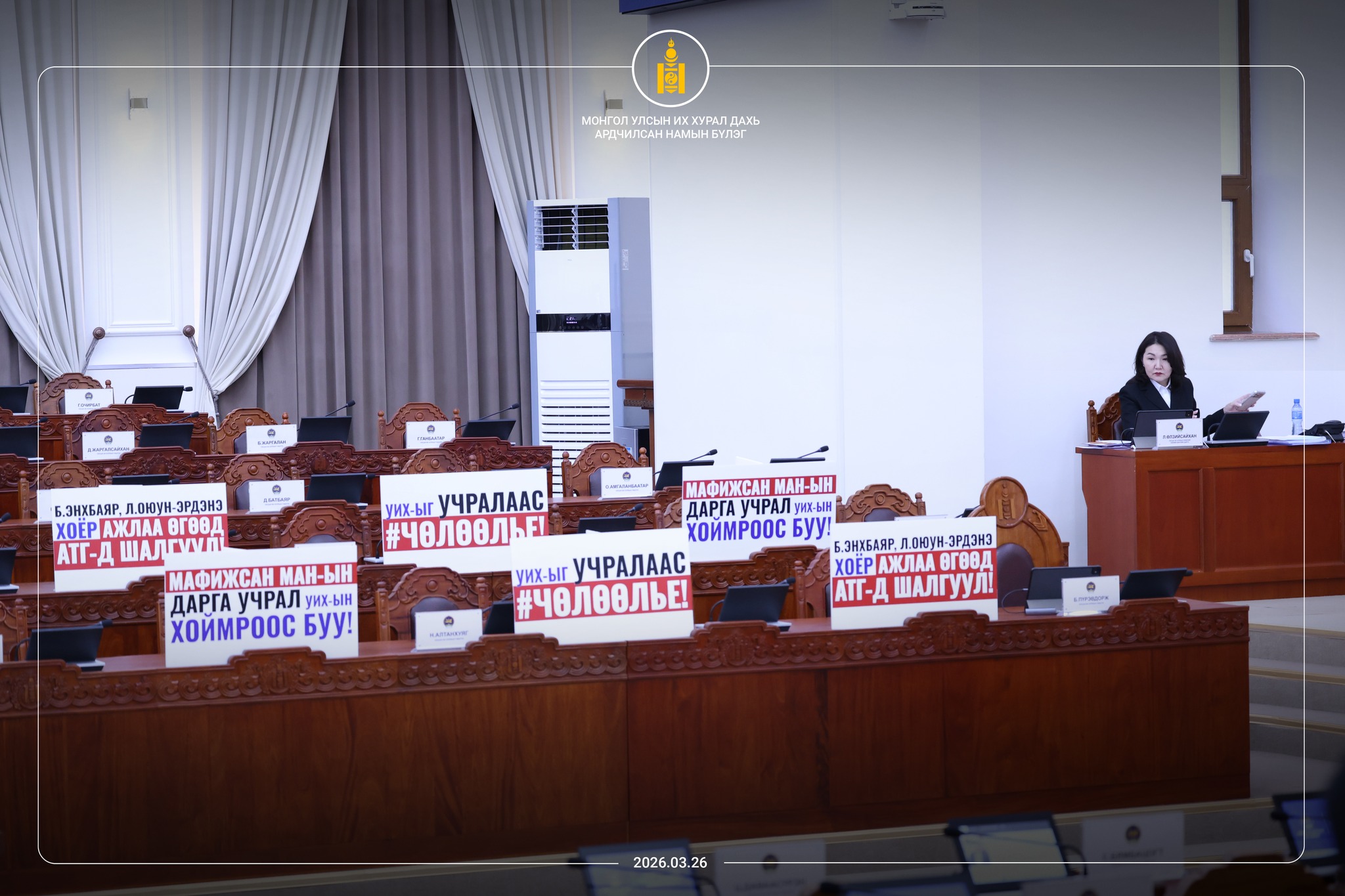 Энэ үеэр УИХ-ын гишүүн, УИХ дахь Ардчилсан Намын бүлгийн дарга, Ардчилсан Намын дарга О.Цогтгэрэл: УИХ-ын чуулган хоёр дахь долоо хоногтоо хуралдсангүй. Ардчилсан намгүйгээр ирцээ бүрдүүлээд хуралдах бүрэн дүүрэн боломж байгаа. Хурлыг явуулахгүй байгаа нь бид биш, тэд. Улс орноо засаглаж чадахгүй бол ард түмэндээ үнэнгээ хэлэх хэрэгтэй. Бид чадахгүй юм байна гэдгээ хэл. Хууль хяналтынхныг удирддаг ХЗДХ-ийн сайд Б.Энхбаяр, дэд сайдтайгаа мафийнхаа оролцогч болчихсон байна. Б.Энхбаяр маш яаралтайгаар ажлаа өгөөд шалгуулах ёстой. Н.Учрал УИХ-ын даргаасаа өөрөө буухгүй бол бид огцруулах арга хэмжээ авна гэв.
