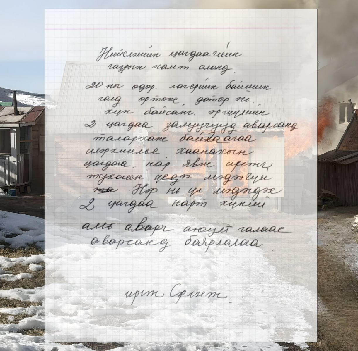 Иргэн: Би нөхөртэйгөө Чингэлтэй дүүргийн 19 дүгээр хорооны нутаг дэвсгэрт Яргайтын зусланд амьдардаг юм. Энэ оны 03 дугаар сарын 19-ний өдөр 15 цагийн орчим нөхөр маань гэртээ ганцаараа унтаж байх үед байшинд маань гал гарсан. Тухайн үед ажлаа хийж явсан цагдаагийн 2 алба хаагч манай байшингаас утаа гарахыг анзаарч очиж, 63 настай нөхрийн минь амь насыг нь аварсан. Нөхөр маань одоо III дугаар зэргийн түлэгдэлтэй эмнэлэгт хэвтэж байгаа. Тухайн үед гал байшинг бүхэлд нь хамарсан, дотогш орох боломжгүй байсан гэж хүмүүсийн хэлснийг сонсоод цагдаа нар яаж орж нөхрийг маань аварсныг болон тэдгээр цагдаа нар явж таараагүй бол гэж бодохоор талархаад баршгүй байна. Нөхрийг минь аварсан нэрийг нь мэдэхгүй, зүс танихгүй 2 цагдаадаа үнэхээр их баярлаж байна.