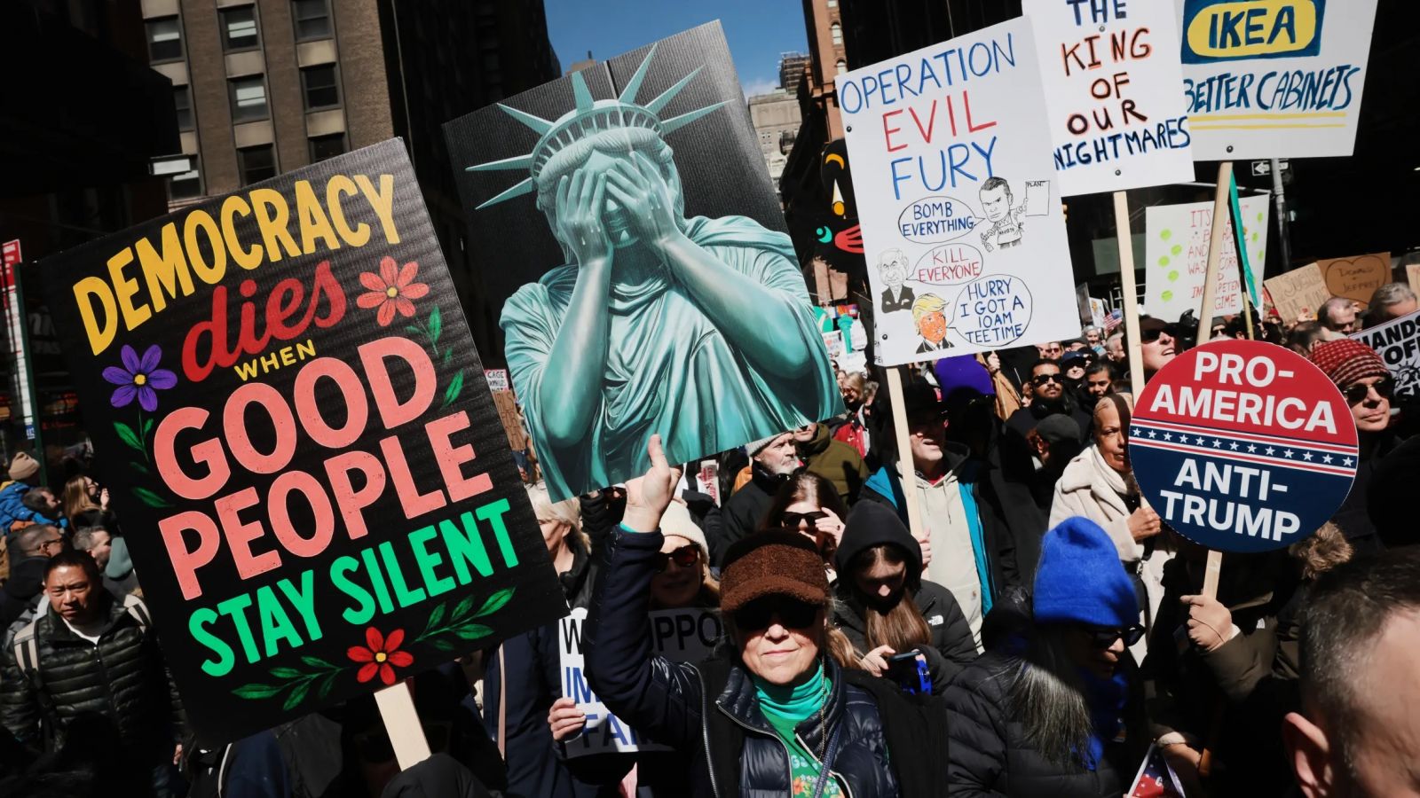 Бямба гарагт Вашингтон хотод бүтэн өдрийн турш эсэргүүцлийн жагсаал өрнөсөн бол Нью Йорк хотын Таймс скверт олон мянган хүн цуглан, эсэргүүцлээ илэрхийлжээ.