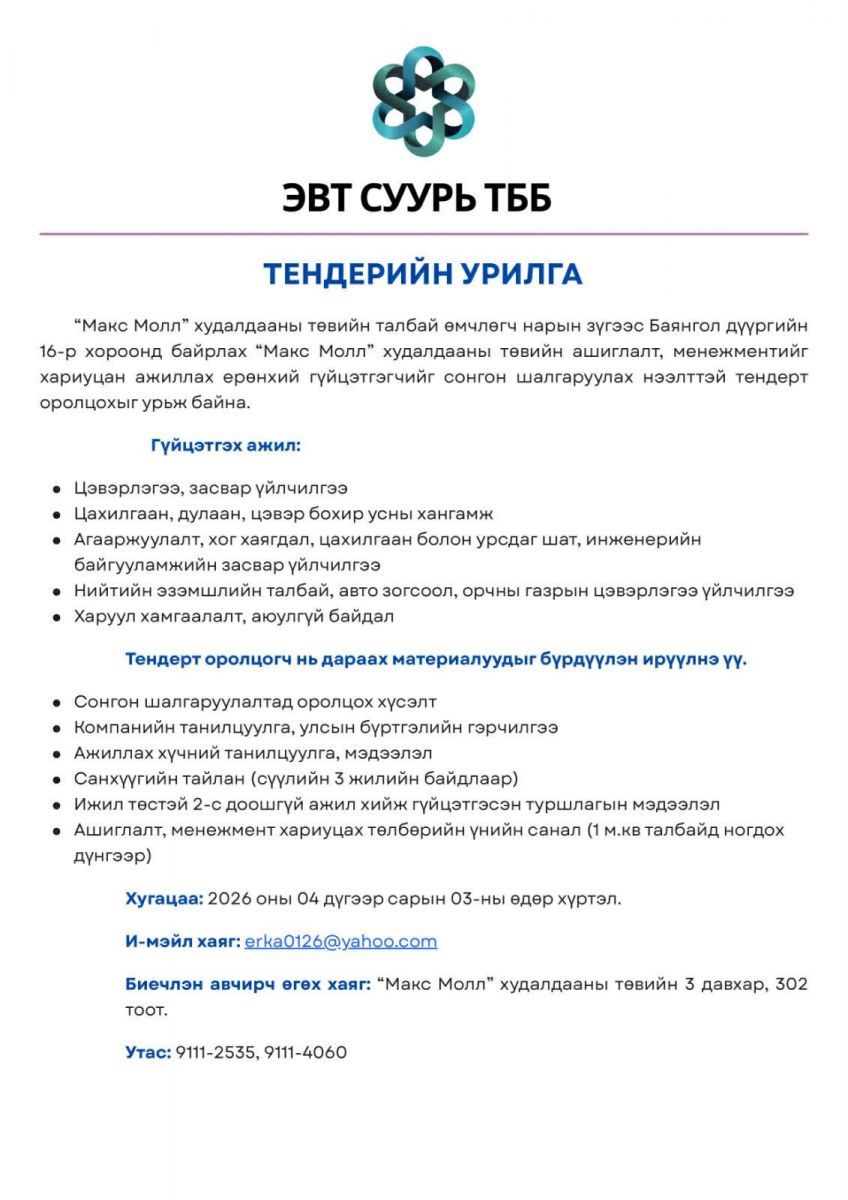 ТЕНДЕРИЙН УРИЛГА I "Макс Молл" төвийн менежментийг хариуцах гүйцэтгэгч…