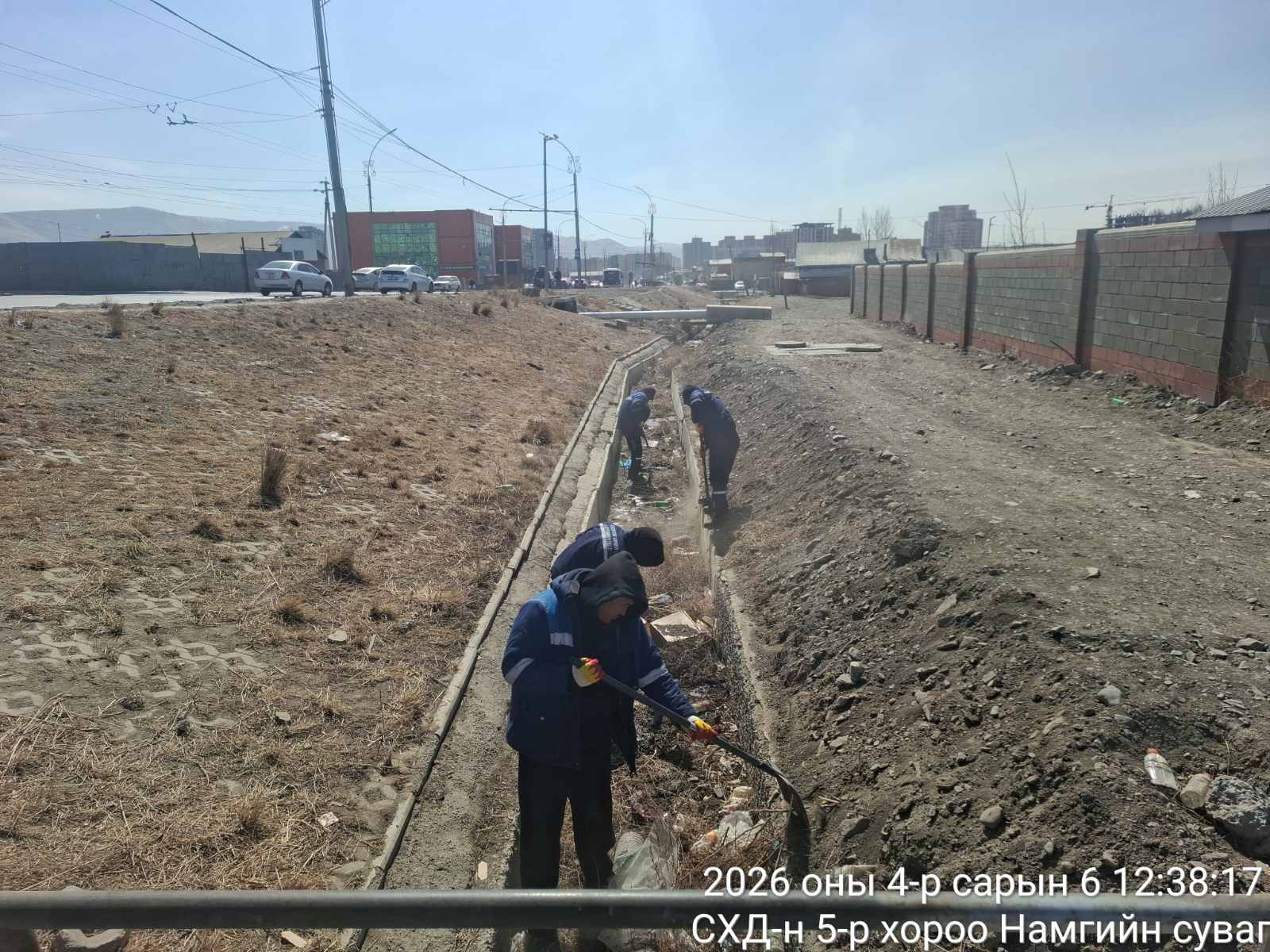 Үерийн хамгаалалтын барилга, байгууламжийн цэвэрлэгээний ажлын хүрээнд Геодези, усны барилга байгууламжийн газраас Сонгинохайрхан дүүргийн 5, 27 дугаар хороонд байрлах Намгийн сувгийг цэвэрлэж, суваг дээгүүрх гарц гаргалгааны доогуурх мөс, лагийг гар молдок ашиглан цэвэрлэлээ. Геодези, усны барилга байгууламжийн газар нийслэлийн хэмжээнд 165.7 км үерийн хамгаалалтын барилга байгууламжийн байнгын ашиглалтыг хариуцан ажилладаг. 2026 оны байдлаар 32 байршлын 34.8 км үерийн хамгаалалтын барилга байгууламжаас нийт 42.7 мянган шоо метр лаг хагшаас цэвэрлэхээр төлөвлөн ажиллаж байна.