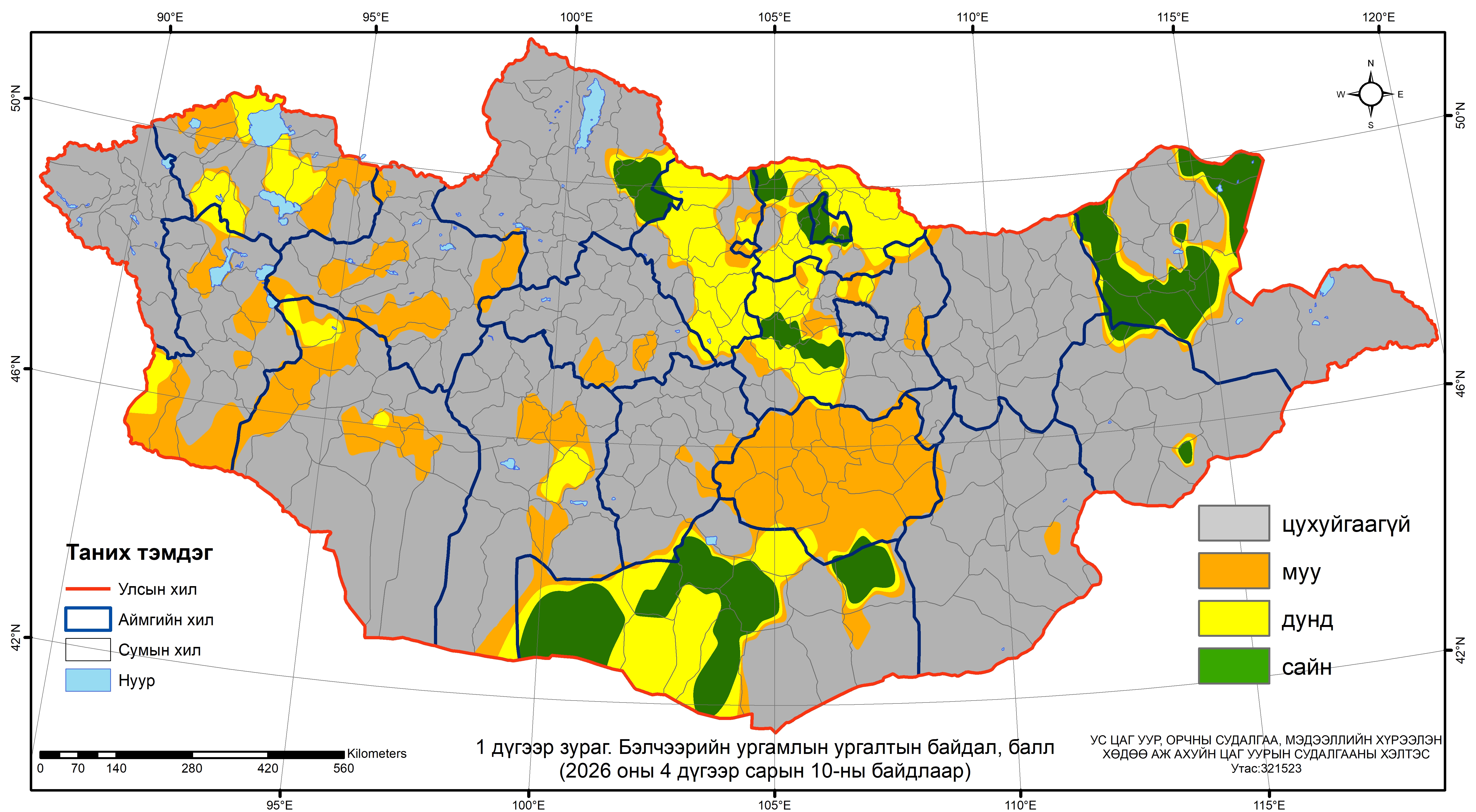 Бэлчээрийн ургамлын ургалтын байдал 4 дүгээр сарын 10-ны байдлаар нийт нутгийн 60 гаруй хувьд цухуйгаагүй, Дундговийн нийт, Ховд, Говь-Алтай, Завханы зарим, Увс, Баянхонгор, Архангай, Өвөрхангайн ганц нэг сумдын нутгаар муу, бусад нутгаар дунд байна. Өмнөх жил өдийд нийт нутгийн 80 орчим хувьд ургамал цухуйсан байсан бол энэ жилийн хувьд зарим нутгаар бэлчээрийн ургамал оройтож ургаж байна.(1 дүгээр зураг).