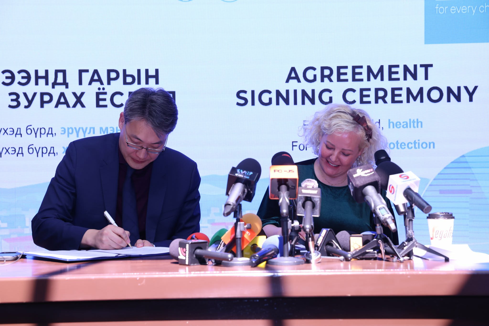 Мэдээллийн төгсгөлд нийслэлийн Засаг даргын орлогч А.Амартүвшин Монгол дахь НҮБ-ын Хүүхдийн сангийн Суурин төлөөлөгч Биате Дастелтай хамтран ажиллах санамж бичигт гарын үсэг зурлаа. Уг санамж бичгийн хүрээнд талууд хүн амын тэр дундаа хүүхдүүдийн эрүүл мэнд, хүүхэд хамгааллын чиглэлээр тогтвортой хамтран ажиллахаар боллоо.