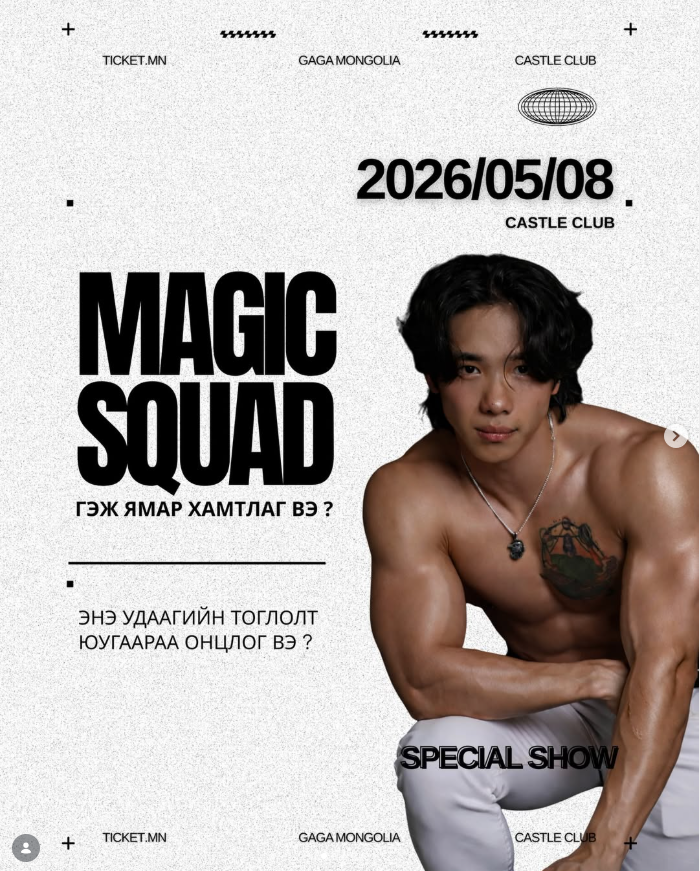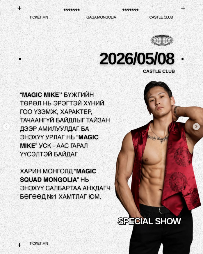 "Magic Mike" хэмээх киноноос үүдэн гарсан "Magic Mike" хэмээх шоу дэлхийн олон улс оронд зохион байгуулагддаг билээ. Энэхүү шоу нь эр хүний халуухан булчинлаг биеийг эротик бүжгийн хөдөлгөөнтэй хослуулсан тайзны үзүүлбэрээрээ алдартай энтертаймент шоу бөгөөд "Magic Squad Mongolia" 1 жилийн ойн баяраа тохиолдуулан бүрэн хэмжээний "Magic Mike" шоу тоглолт зохион байгуулахаар зэхжээ.
