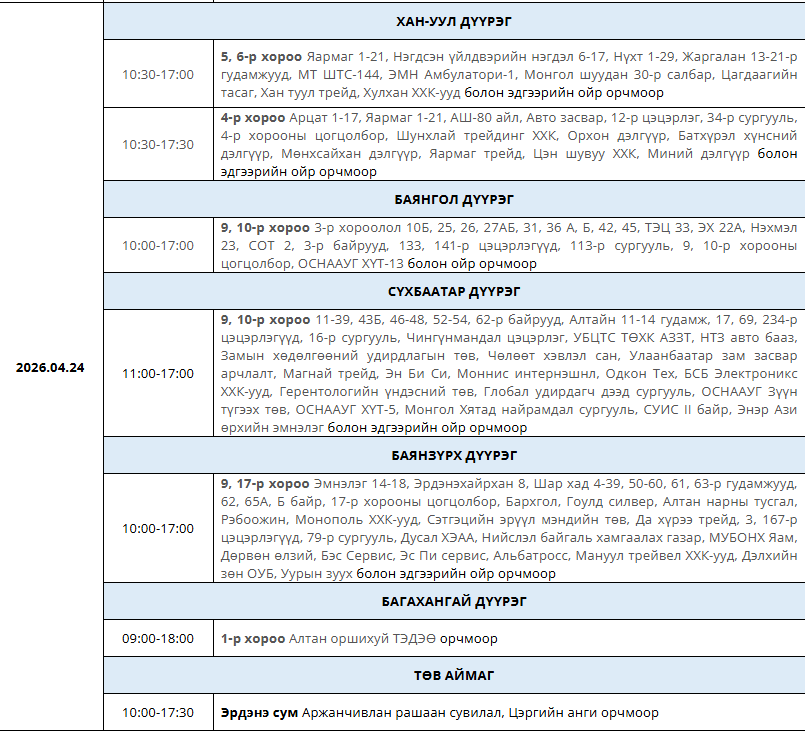 Өнөөдөр буюу дөрөвдүгээр сарын 24-ний өдөр цахилгаан шугам тоноглолд засвар үйлчилгээ хийх хуваарийг танилцуулж байна. Тодруулбал, Багахангай, Хан-Уул, Баянгол, Баянзүрх, Сүхбаатар дүүргүүдэд болон Төв аймгийн Эрдэнэ суманд цагийн хуваарийн дагуу цахилгаан хязгаарлана.