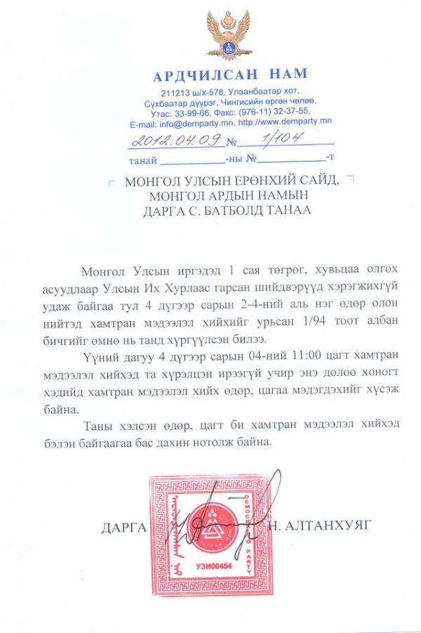 Ардчилсан намын дарга Н.Алтанхуяг өнөөдөр Монгол Улсын Ерөнхий сайд, МАН-ын дарга С.Батболдод хандан дахин албан тоот илгээжээ. Түрүүчийн долоо хоногт хамтарсан мэдэгдэл хийхээр зарласан ч МАН-ын дарга, МУ-ын ерөнхий сайд С.Батболд уг асуудлыг албан ёсоор тавиагүй гээд хамтарсан мэдэгдэл хийхэд ирээгүй билээ. АН-ын даргын хувьд иргэн бүрт олгохоор төлөвлөсөн нэг сая төгрөг, тэр дундаа хувьцаа яагаад ард түмний гарт очихгүй, одоо хэр нь данс нь улаан байна вэ гэдэгт гүйцэтгэх засаглалын тэргүүнийг мэдээлэл хийхийг хүсч буй ажээ.