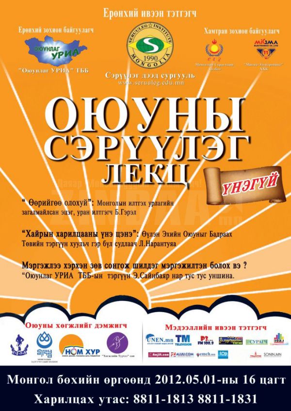 ОЮУНЛАГ УРИА ТББ нь Монголын сурагчдын холбоотой хамтран “ОЮУНЫ СЭРҮҮЛЭГ” лекцийг 2012.05 сарын 01-нд Монгол бөхийн өргөөнд 16.00 цагт 2 дахь жилдээ зохион байгуулах гэж байна. ОЮУНЫ СЭРҮҮЛЭГ лекц нь өнгөрсөн оны 4 сарын 8-нд МҮЭСТ Ордонд амжилттай болж байсан. Цаашид тус лекцийг жил бүр уламжлал болгон зохион байгуулж байхаар тогтсон билээ . Энэхүү лекц нь ЕБС-ийн төгсөгчдөд зориулж үнэ төлбөргүйгээр ганцхан удаа болно.