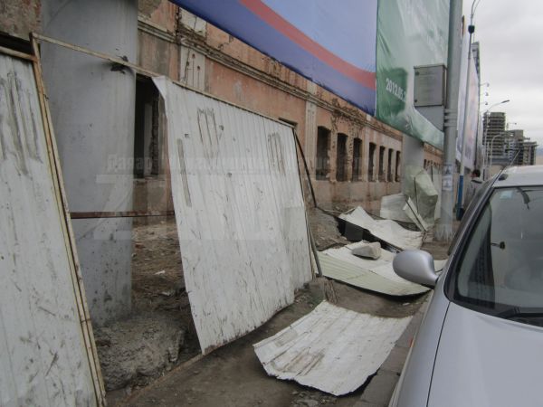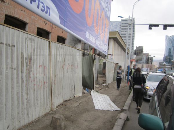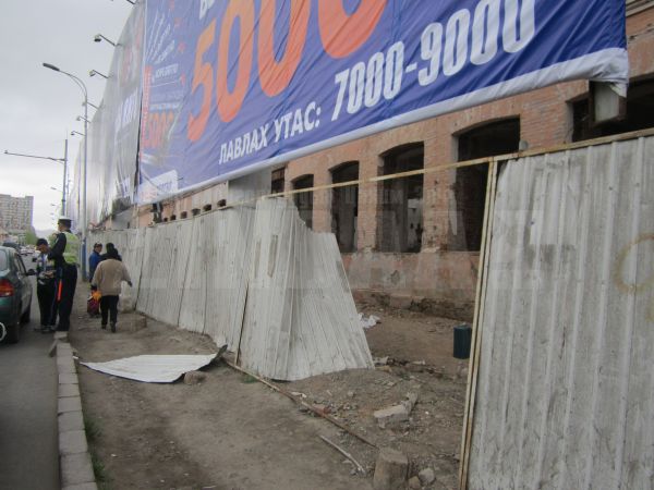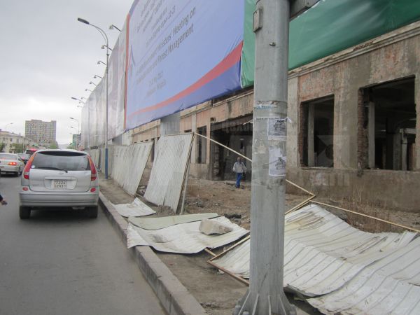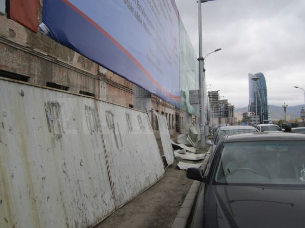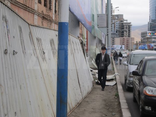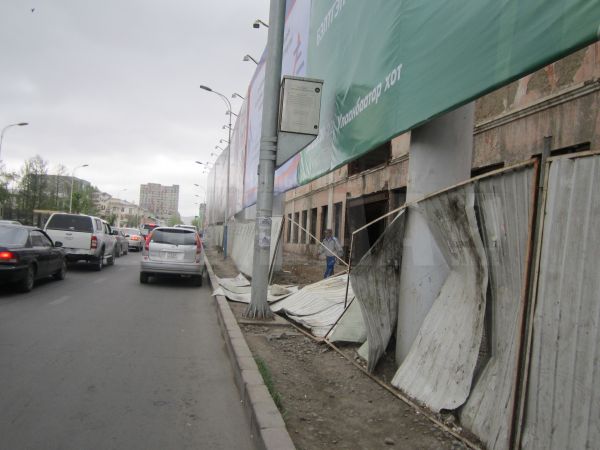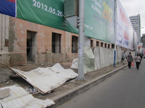 Энэ зургийг харсан хэн ч Д.Сүхбаатарын нэрэмжит улсын хэвлэх үйлдвэрийн барилга гэж танина. 50 гаран жилийн түүхтэй энэ “балгас”-ыг хэвлэлийнхний цор ганц өмч гэж ойлгон хүндлэн дээдлэх хүн ч байдаг. Өнгөрсөн хаваржингаа л тус хэвлэх үйлдвэрийн хувьчлалын тухай маргасан. Харин энэ жил нэг иймэрхүү дүр зурагтай. Өнөөдөр Улсын маань нийслэл Улаанбаатарт салхитай байгааг ч хэлэх үү, хэвлэх үйлдвэрийн хашааны төмрүүд ийм тийш, тар няр хийж байв. Хашааны чимээ, савлах төмөр хоёр хажуугаар нь өнгөрөх явган хүмүүст айдас төрүүлэхүйц байв. Мэдээж оногдож, бэртэж гэмтчих вий гэсэн болгоомжлол байж таарна.