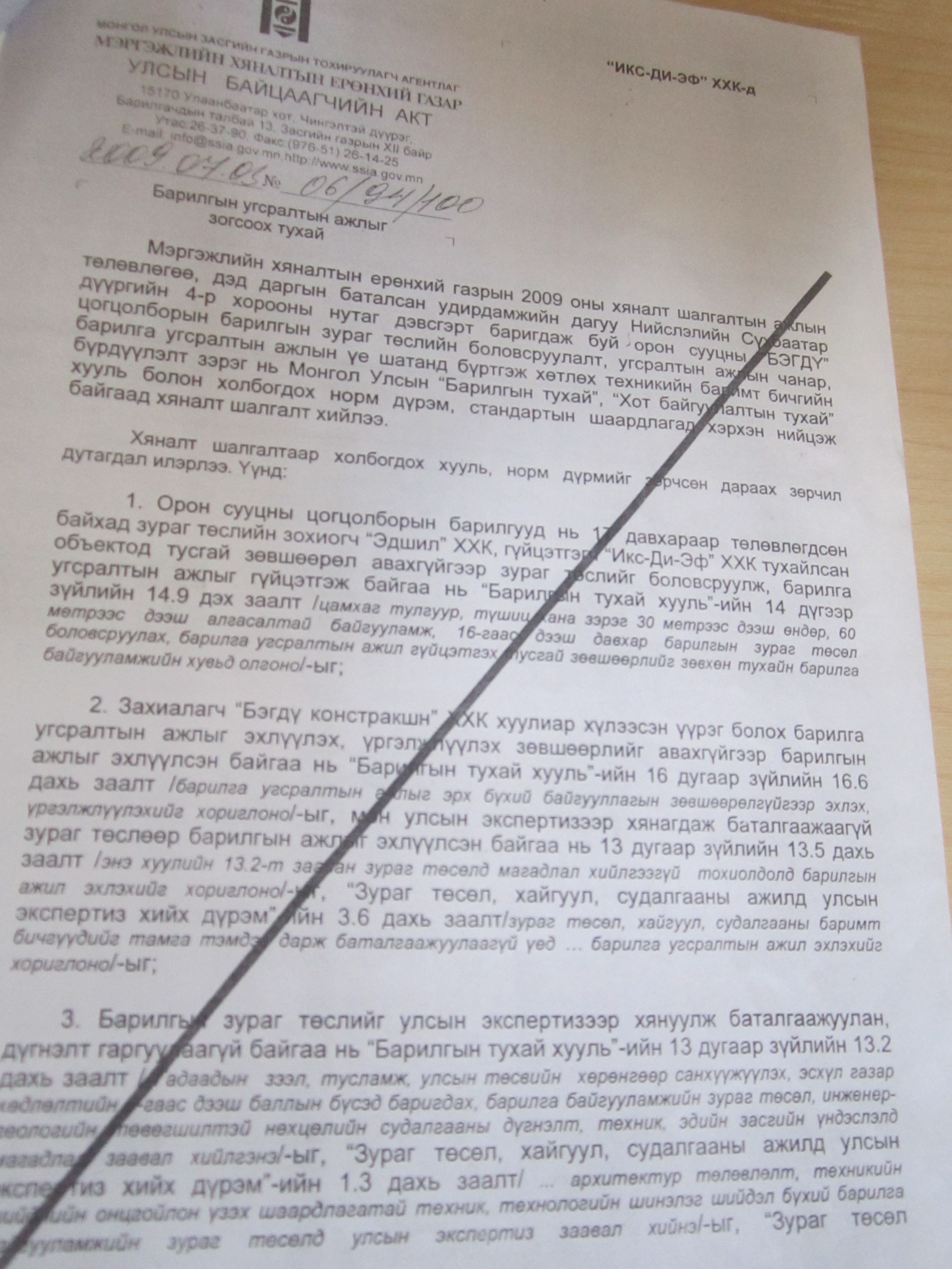 -Хууль бусаар барахгүй давхцал үүссэн гэсэн Мэргэжлийн хяналт, Хот байгуулалтын газрын хамтарсан дүгнэлт гарсан шүү дээ. Цэцэрлэгийн хашаанаас бол өргөөшөө гурван метр, уртаараа 60 метрийг л эзэгнэчихээд байна. Уг нь улсын стандартаараа бол сургууль, цэцэрлэгээс 50 метрийн зайтай барилга баригдах ёстой байдаг. Үнэхээр л барилга барьж, ашиг олох гээд байгаа юм бол энэ бүгдийг хуулийн дагуу болгоод барих хэрэгтэй шүү дээ.