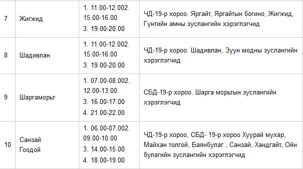 Зургаан буудал, Долоон буудал, Чингэлтэй, Хайлааст, Бэлх, Сэлбэ, Дамбадаржаагийн гэр хороолол болон Салхит, Зуун мод, Ар Согоот, Яргайт, Яргайтын богино, Шаргаморьт, Майхантолгой, Гүнт,Баянбулаг, Санзай, Хуурай мухар, Ойн булаг, Хандгайт зэрэг зуслангийн нийт хэрэглэгчдийн цахилгаан хангамжийн найдвартай байдлыг дээшлүүлэх, өвлийн ачааллыг даван туулах зорилгоор “Хайлааст” дэд станцын трансформаторын хүчин чадлыг нэмэгдүүлэх ажил өнөөдрөөс эхлэнэ. Үүнтэй холбоотойгоор дээр дурьдсан газруудад өнөөдрөөс эхлэн цахилгааны хязгаарлалт хийх гэнэ. Энэ сарын 24-нийг хүртэл өдөр бүр нэг цагийн хугацаатайгаар дөрвөн удаа цахилгааны хязгаарлалт хийгдэх юм байна. Ингээд цахилгааны хязгаарлалтын хуваарийг хүргэе.