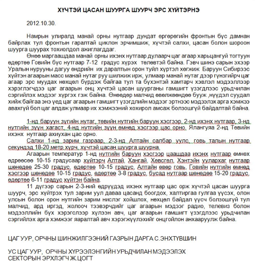 Өнөө маргаашдаа манай орны ихэнх нутгаар дулаарч цаг агаар харьцангуй тогтуун өдөртөө Говийн бүс нутгаар 7-12 градус хүрэх төлөвтэй байна. Гэвч шинэ сарын эхээр Уралын нурууны дагуу өндрийн их даралтын орон туйл хүртэл хөгжиж Баруун Сибирээс хүйтэн агаарын масс манай нутаг руу шилжиж ирж, улмаар манай нутаг дээр гүнзгийрч цаг агаар эрс муудах нөхцөл бүрдэж байгаа тул та бүхэнтэй хамтарч хэвлэл мэдээллээр хэрэглэгчдээ цаг агаарын онц хүчтэй цасан шуурганы гамшигт үзэгдлээс урьдчилан сэргийлэх мэдээг хүргэх гэж байна. Өнөөдөр малчид өвөлжөөндөө бууж ,нүүдэл суудал хийж байгаа энэ үед цаг агаарын гамшигт үзэгдлийн мэдээг эртнээс мэдээлэх арга хэмжээ авахгүй бол цаг алдаж улмаар их хэмжээний хохирол амсаж болзошгүй байдалтай байна.